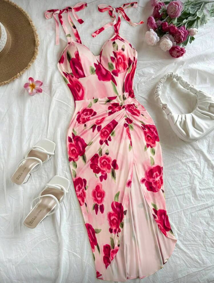 Sheridan Floral Halter Neck Mesh Dress (White/Pink)