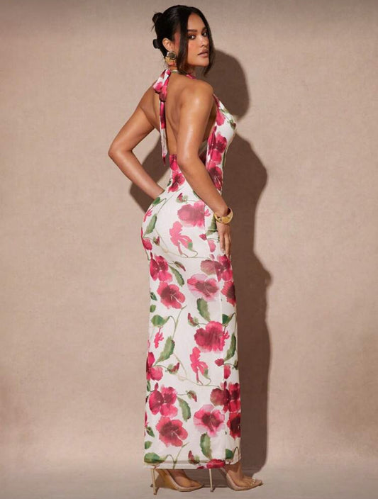 Sheridan Floral Halter Neck Mesh Dress (White/Pink)