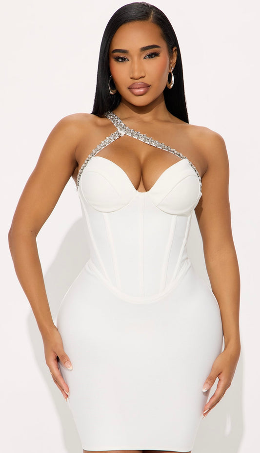 Ella Square Neck Rhinestones Bandage Dress (White)