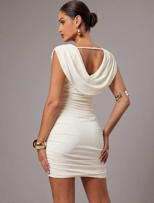Draped Collar Ruched Satin Bodycon Dress (Gold)