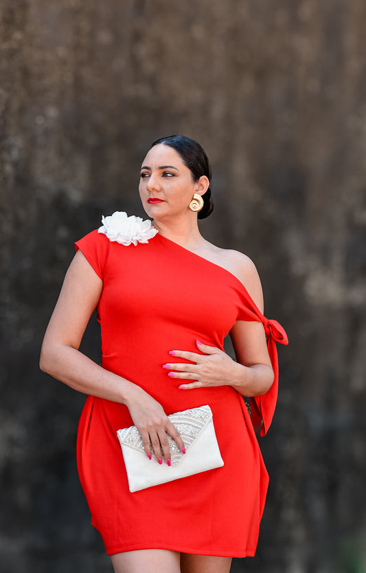 Dahlia Elegant Flower Detail Bodycon Hourglass Shaped Dress (Red)