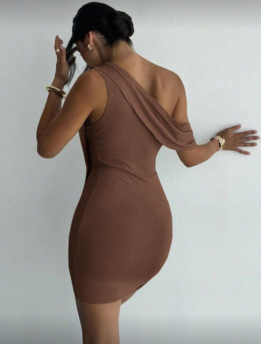 Oro Chocolate Draped Asymetrical Short Dress (Brown)