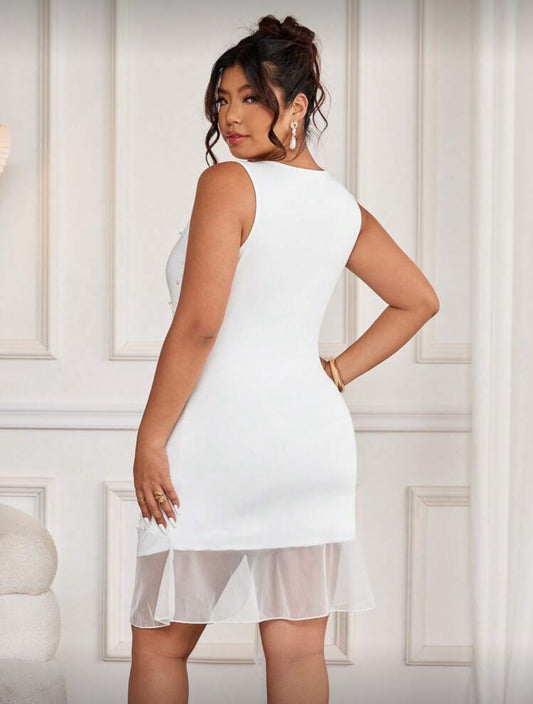 Ellen Plus Size Round Neck with Pearls Mesh Dress (White)